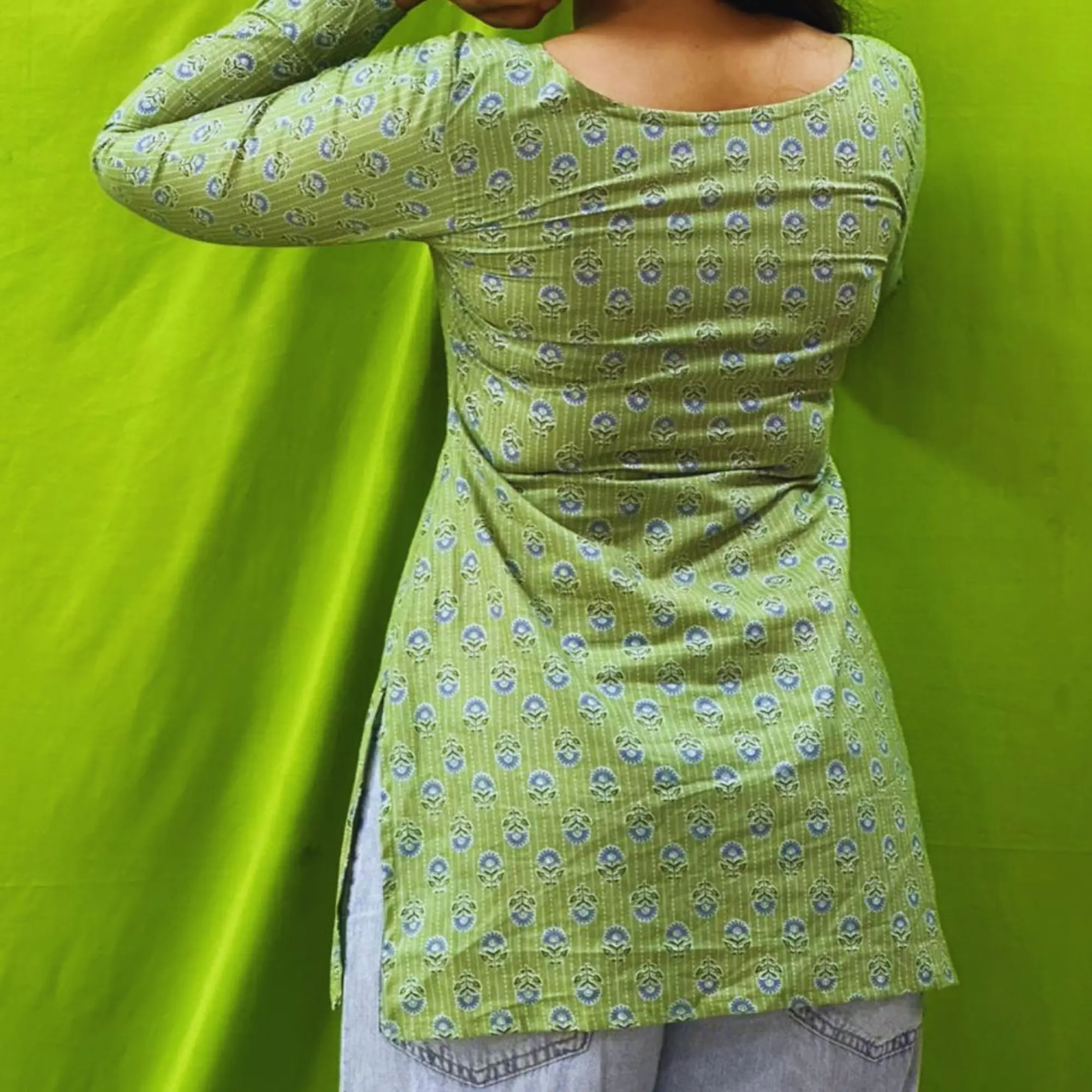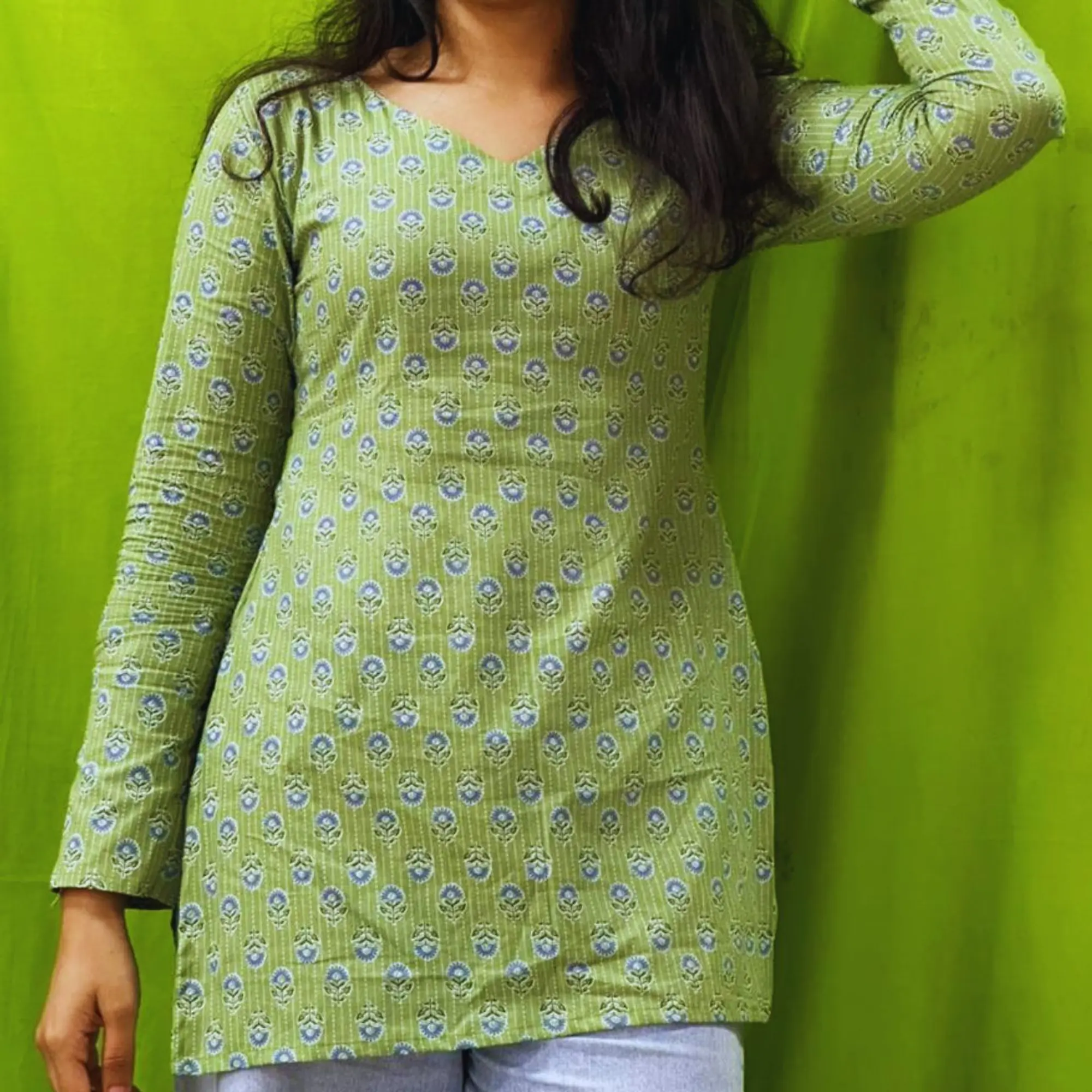 This elegant Sage green kurti features a delicate all-over floral buta print in soothing blue and white tones. Designed with a flattering sweetheart neckline and full sleeves, it offers a graceful yet comfortable look for everyday wear. The straight silhouette and side slits ensure ease of movement while maintaining a structured appearance. Crafted from soft, breathable cotton fabric, this kurti is perfect for office wear, college, or casual outings. Pair it with denim or ethnic bottoms to create a versatile and stylish look that blends tradition with modern charm.