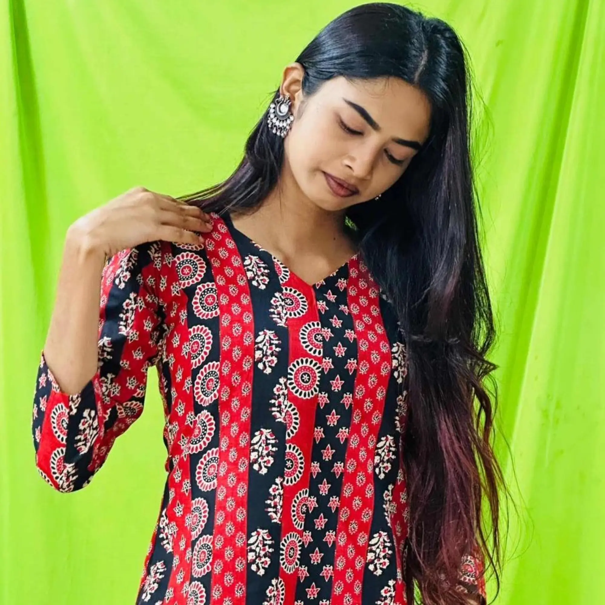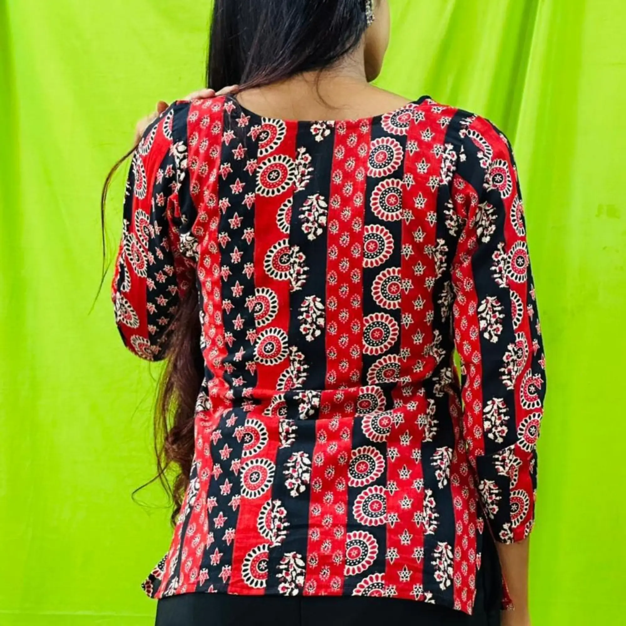 A bold fusion of red and black in timeless ethnic prints, this V-neck top is designed to make everyday styling effortless yet striking. The vertical patterned panels create a flattering silhouette, while the soft fabric ensures comfort all day long. Perfect for college wear, casual outings, or styling with skirts and palazzos for a semi-ethnic look.