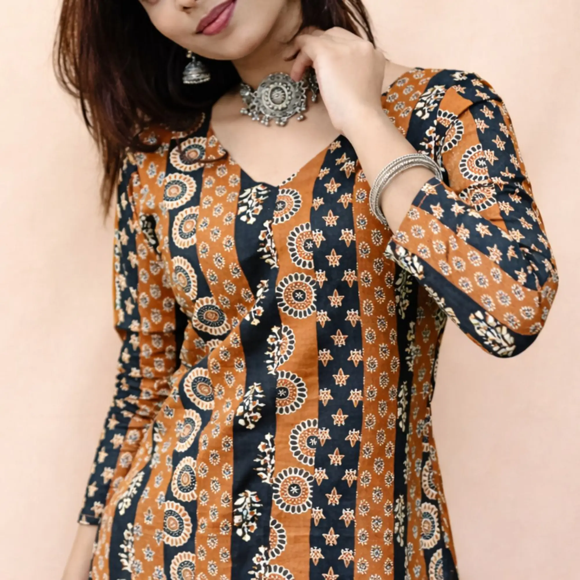 A bold fusion of red and black in timeless ethnic prints, this V-neck top is designed to make everyday styling effortless yet striking. The vertical patterned panels create a flattering silhouette, while the soft fabric ensures comfort all day long. Perfect for college wear, casual outings, or styling with skirts and palazzos for a semi-ethnic look.