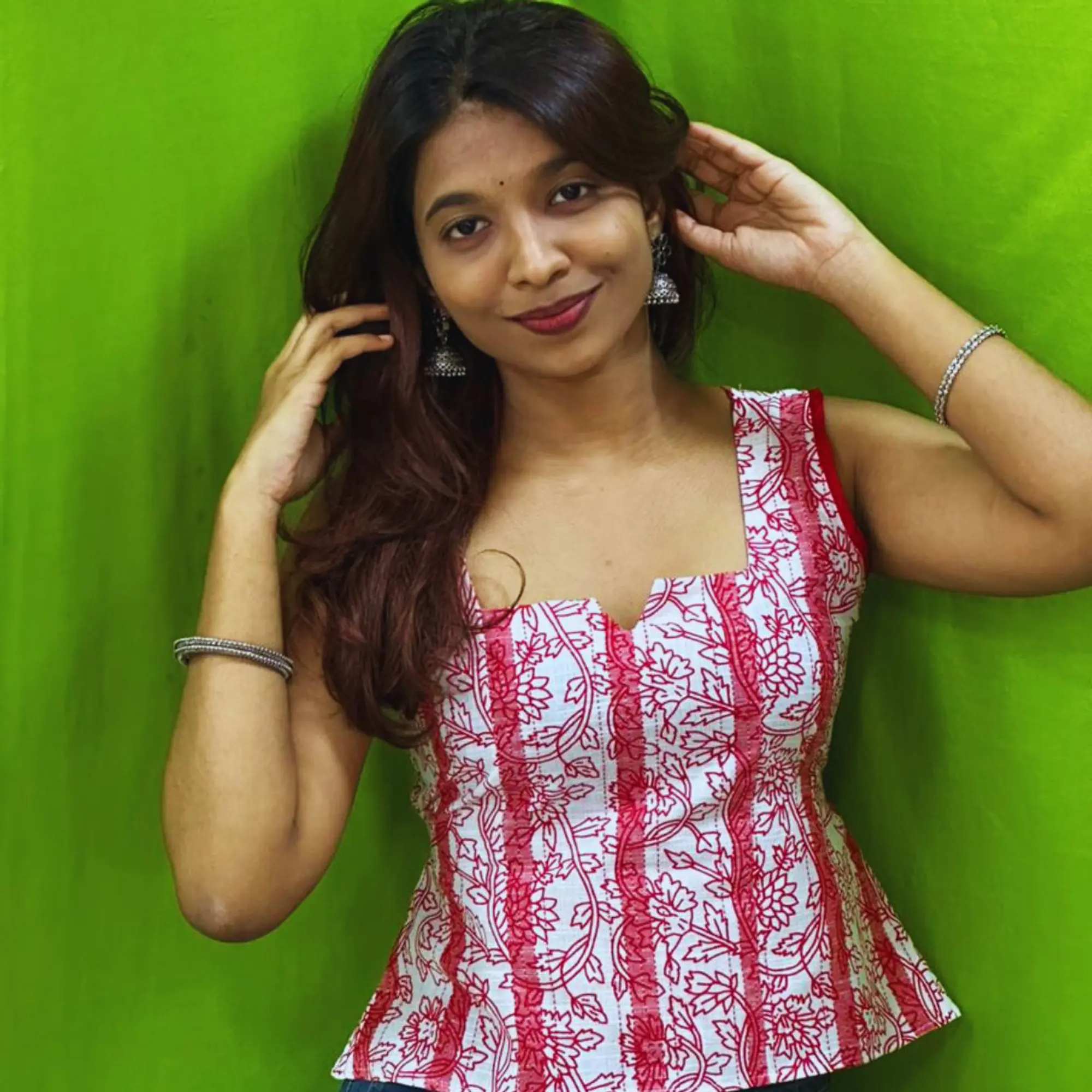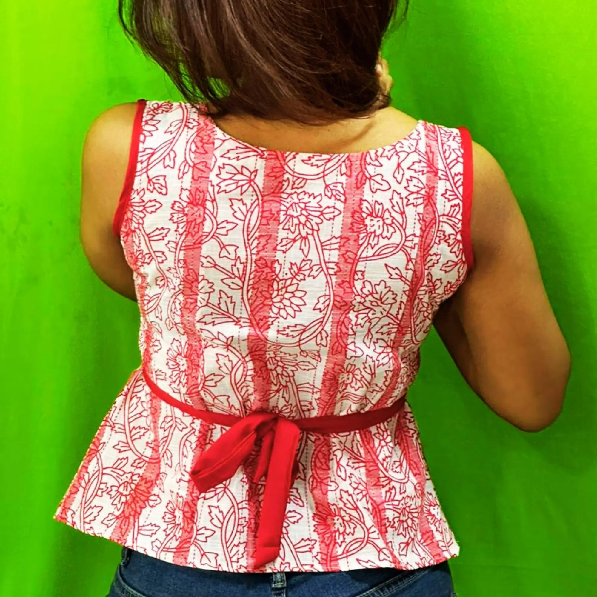 This stylish sleeveless top features an elegant floral print in red and white, designed to flatter the waist with its fitted bodice and flared hem. The square neckline enhances the neckline beautifully, while the adjustable back tie-up ensures a customized and comfortable fit. Made from soft, breathable fabric, this top is ideal for casual outings, brunches, and everyday wear. Pair it effortlessly with jeans, skirts, or trousers for a chic and feminine look.