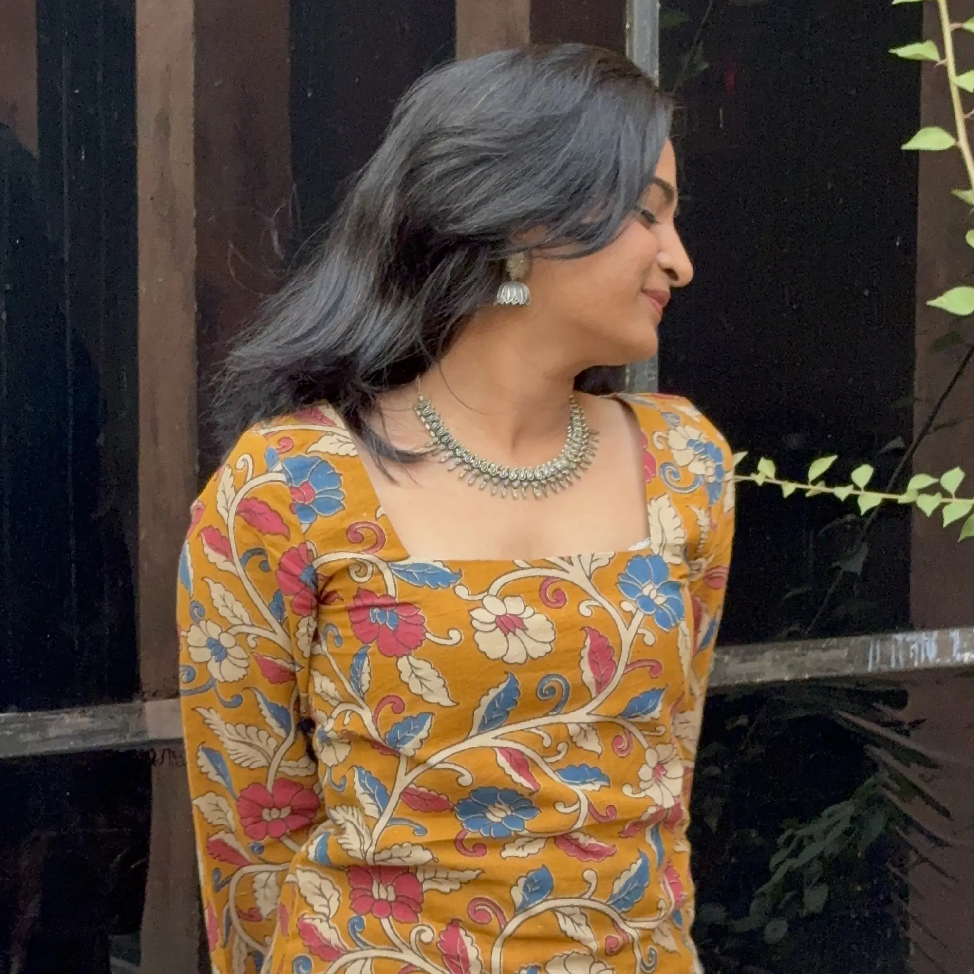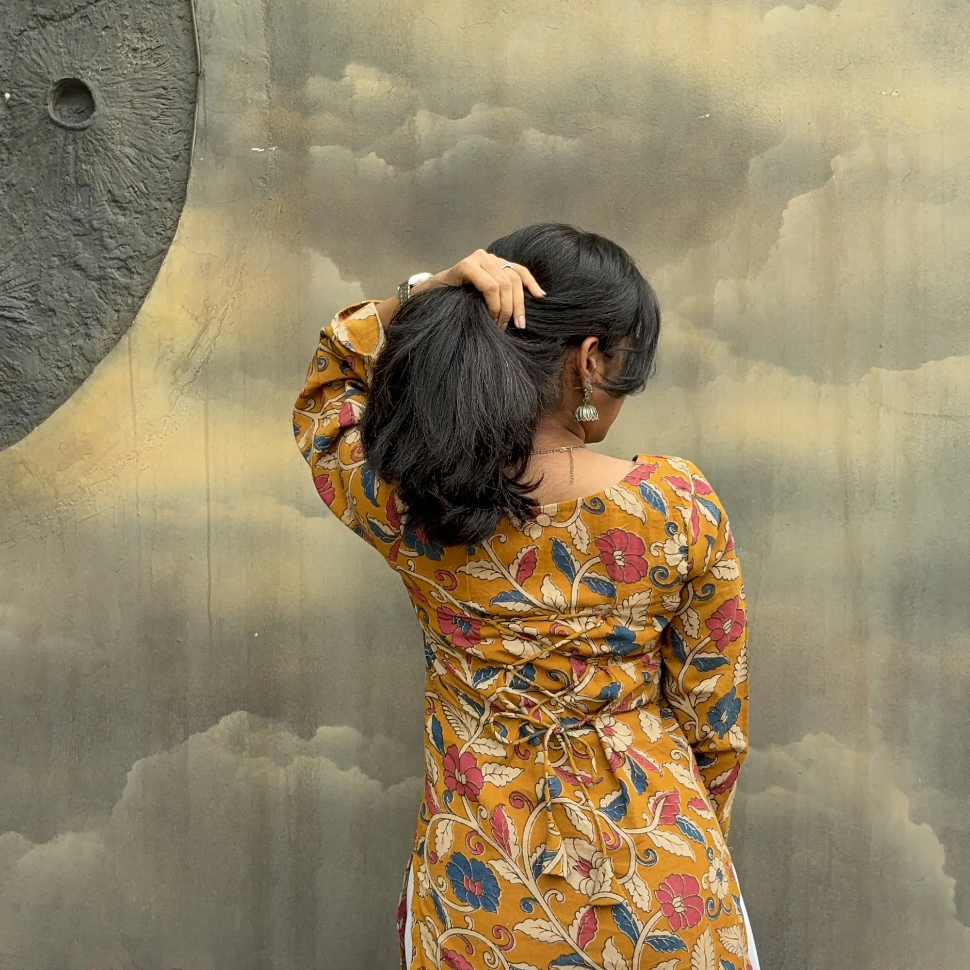 The Meera Floral Kurti is a celebration of color, creativity, and confident femininity. Set on a rich mustard base and adorned with bold floral and vine-inspired motifs, this kurti brings an artisanal charm with a contemporary silhouette. The structured yoke and flared sleeves add movement and elegance, making it a standout piece for both casual festive moments and elevated daywear.