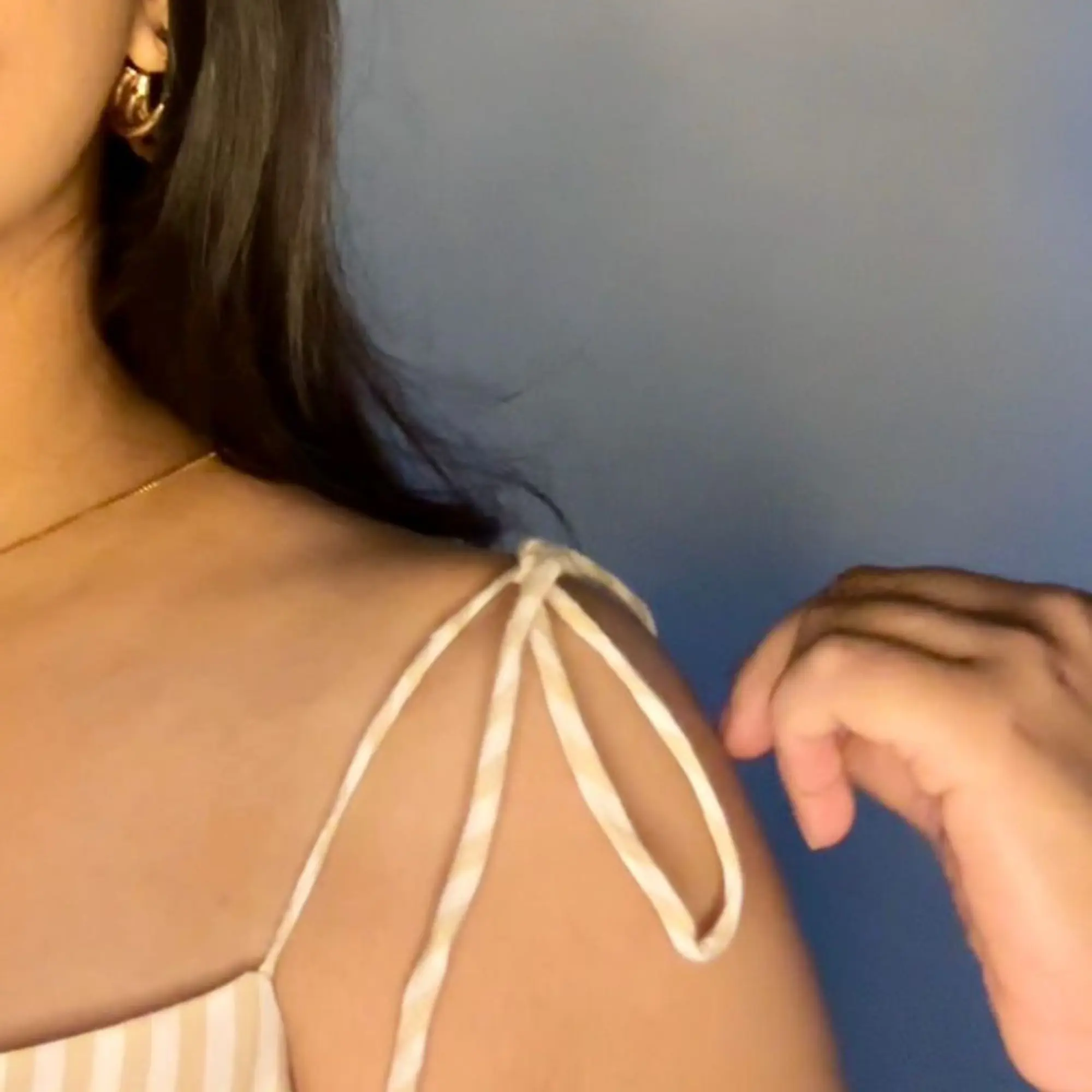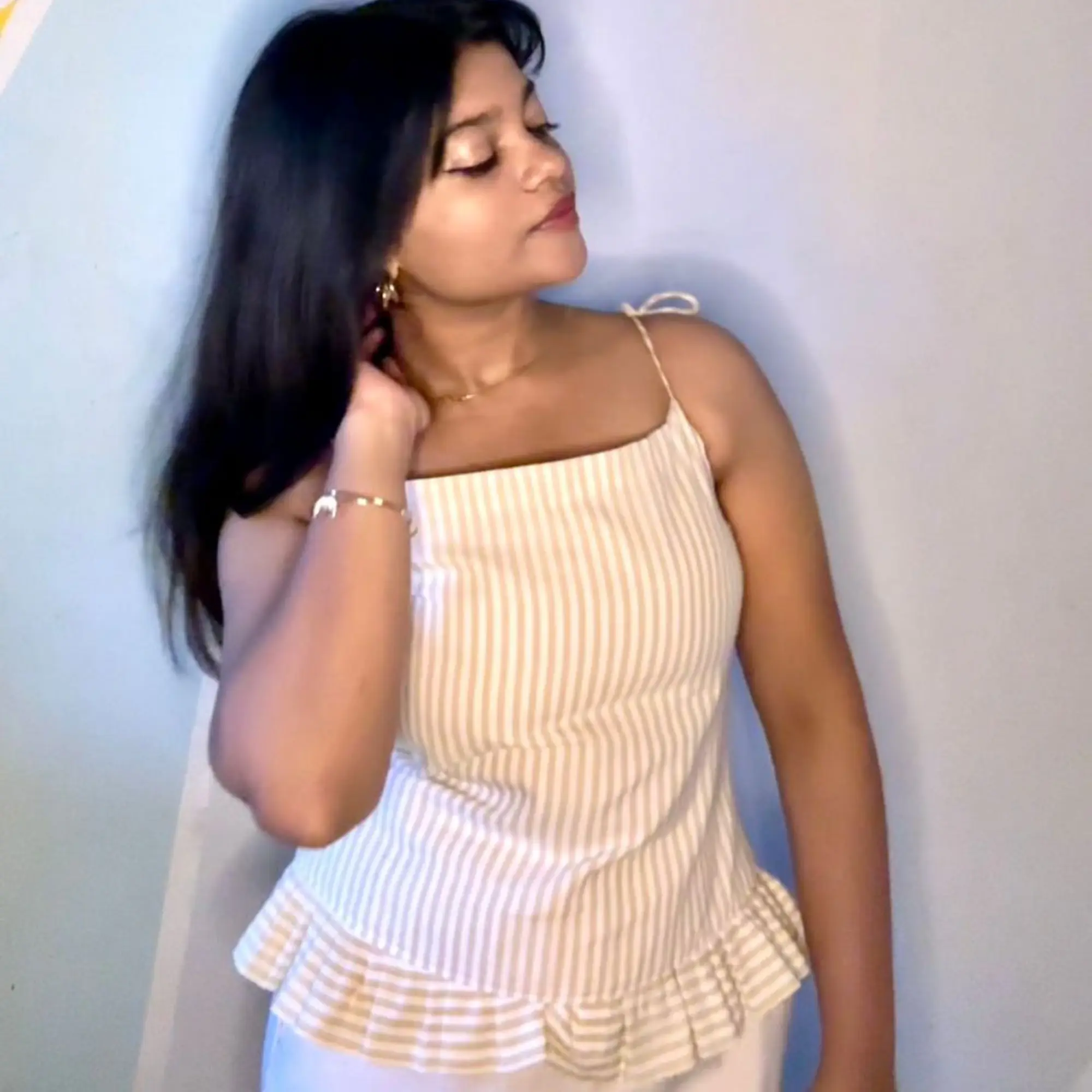 Effortlessly elegant and softly structured, this striped peplum top is designed to bring out a graceful, feminine silhouette. Featuring delicate tie-up shoulder straps and a flattering fitted bodice, it flows into a subtle peplum flare that adds movement and charm. The minimal stripe detailing enhances its refined look, making it perfect for both casual outings and elevated everyday wear. Pair it with tailored trousers or skirts for a clean, modern statement.
